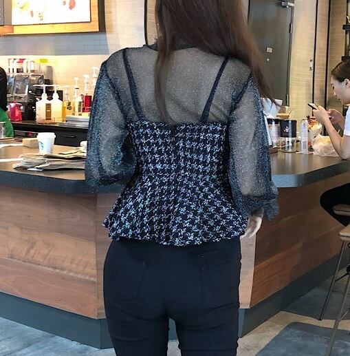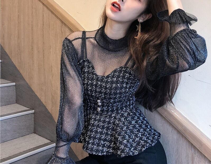 2色展開メッシュblouse+千鳥柄ビスチェ
